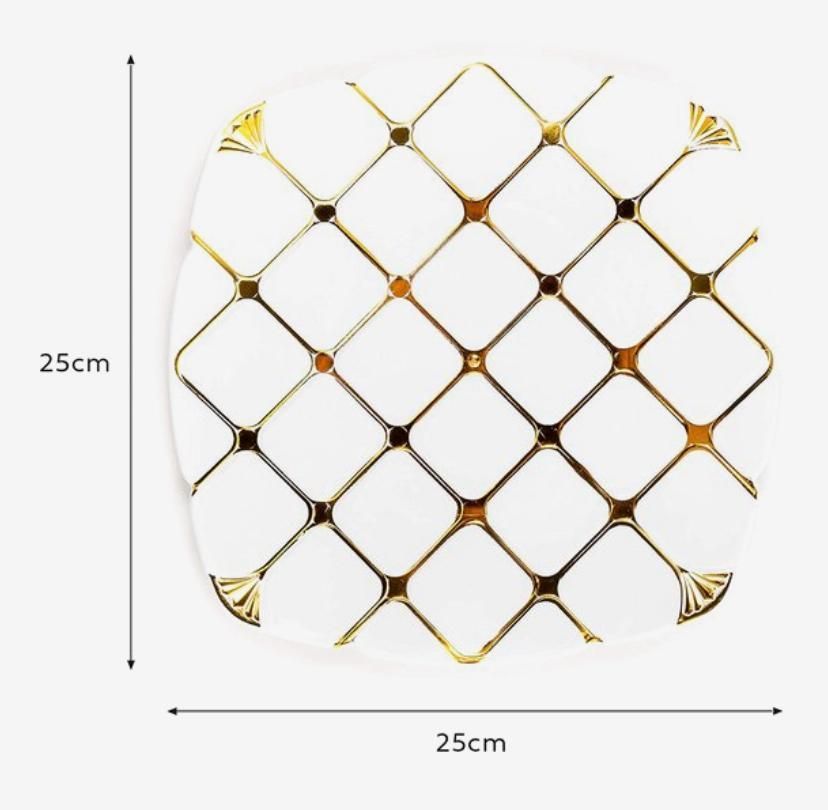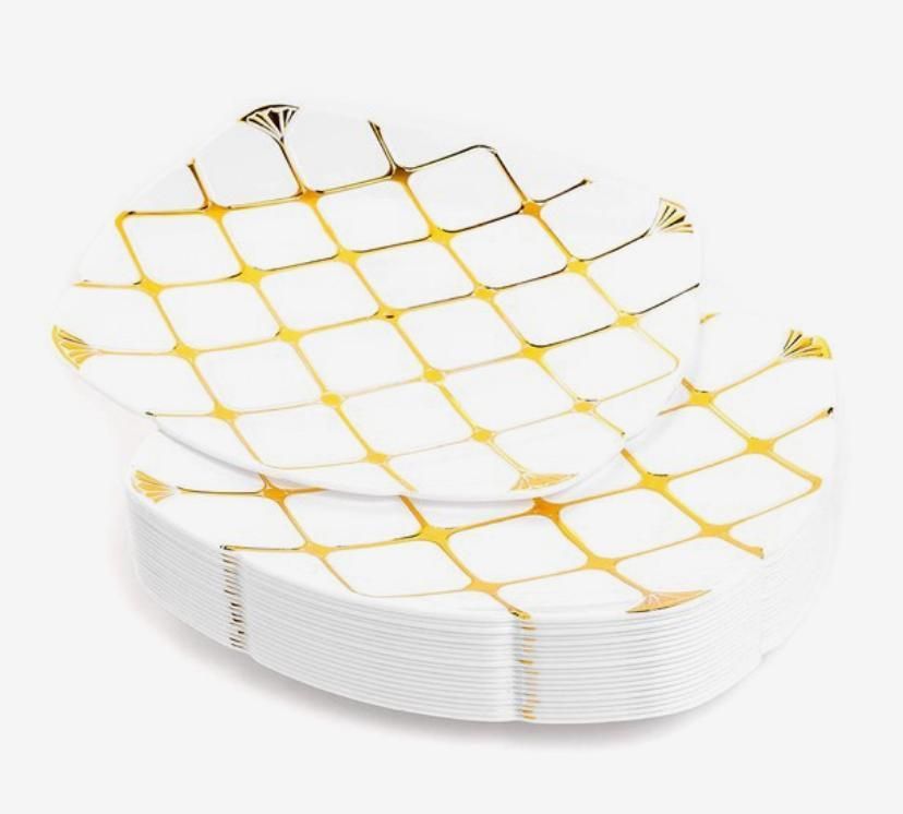 - Elegant ontwerp: De witte vierkante plastic borden zijn voorzien van een prachtig goudpatroon, waardoor ze een stijlvolle en luxe uitstraling hebben.